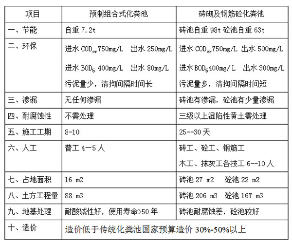 通過以上對(duì)比分析可見采用預(yù)制組合式化糞池不僅施工方便,安裝靈活,而且成本低,利于環(huán)保,彌補(bǔ)了傳統(tǒng)化糞池的所有缺點(diǎn),它將給我們帶來經(jīng)濟(jì)效益和社會(huì)效益,**滿足現(xiàn)階段城市發(fā)展要求,會(huì)在一兩年內(nèi)創(chuàng)造化糞池的革*新時(shí)代。